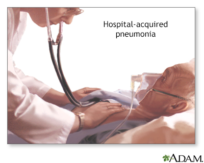 Outlook (Prognosis)People who have other serious illnesses do not recover as well from pneumonia as people who are not as sick. Hospital-acquired pneumonia can be a life-threatening illness. Long-term lung damage may occur. PreventionPeople visiting someone in the hospital need to take steps to prevent spreading germs. The best way to stop the spread of germs is to wash your hands often. Stay home if you are sick. Keep your immunizations up to date. After any surgery, you will be asked to take deep breaths and move around as soon as possible to help keep your lungs open. Follow the advice of your provider to help prevent pneumonia. Most hospitals have programs to prevent hospital-acquired infections. ReferencesChastre J, Luyt C-E. Ventilator-associated pneumonia. In: Broaddus VC, Ernst JD, King TE, et al, eds. Murray and Nadel's Textbook of Respiratory Medicine. 7th ed. Philadelphia, PA: Elsevier; 2022:chap 49. Klompas M. Nosocomial pneumonia. In: Blaser MJ, Cohen JI, Holland SM, et al, eds. Mandell, Douglas, and Bennett's Principles and Practice of Infectious Diseases. 10th ed. Philadelphia, PA: Elsevier; 2026:chap 307. Metersky ML, Kalil AC. Hospital-acquired pneumonia. In: Broaddus VC, Ernst JD, King TE, et al, eds. Murray and Nadel's Textbook of Respiratory Medicine. 7th ed. Philadelphia, PA: Elsevier; 2022:chap 48. | |