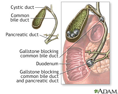 Gallstone in the bile duct; Bile duct stone; Common bile duct stone DefinitionCholedocholithiasis means there is at least one gallstone in the common bile duct. The stone may be made up of bile pigments or calcium and cholesterol salts and are called common bile duct stones. CausesAbout 1 in 7 people with gallstones will develop stones in the common bile duct. This is the small tube that carries bile from the gallbladder to the intestine. Risk factors include a history of gallstones. However, choledocholithiasis can occur in people who have had their gallbladder removed. SymptomsOften, there are no symptoms unless the stone blocks the common bile duct. Symptoms may include: