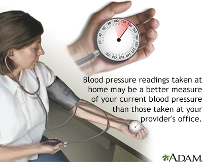 When to Contact a Medical ProfessionalIf you have high blood pressure, you should have regular follow-up visits with your provider. Even if you have not been diagnosed with high blood pressure, it is important to have your blood pressure checked during your regular check-up, especially if someone in your family has or had high blood pressure. Contact your provider right away if home monitoring shows that your blood pressure is still high. PreventionMany people can prevent or delay high blood pressure from occurring by following lifestyle changes designed to bring blood pressure down. ReferencesAmerican Diabetes Association Professional Practice Committee. 10. Cardiovascular disease and risk management: standards of care in diabetes-2025. Diabetes Care. 2025;48(Supplement_1):S207-S238. PMID: 39651970 pubmed.ncbi.nlm.nih.gov/39651970/. Arnett DK, Blumenthal RS, Albert MA, et al. 2019 ACC/AHA guideline on the primary prevention of cardiovascular disease: a report of the American College of Cardiology/American Heart Association Task Force on Clinical Practice Guidelines. Circulation. 2019;140(11);e596-e646. PMID: 30879355 pubmed.ncbi.nlm.nih.gov/30879355/. Bakris GL, Sorrentino MJ. Systemic hypertension: mechanisms, diagnosis and treatment. In: Libby P, Bonow RO, Mann DL, Tomaselli GF, Bhatt DL, Solomon SD, eds. Braunwald's Heart Disease: A Textbook of Cardiovascular Medicine. 12th ed. Philadelphia, PA: Elsevier; 2022:chap 26. Flack JM. Arterial hypertension. In: Goldman L, Cooney KA, eds. Goldman-Cecil Medicine. 27th ed. Philadelphia, PA: Elsevier; 2024:chap 64. Whelton PK, Carey RM, Aronow WS, et al. 2017 ACC/AHA/AAPA/ABC/ACPM/AGS/APhA/ASH/ASPC/NMA/PCNA guideline for the prevention, detection, evaluation, and management of high blood pressure in adults: a report of the American College of Cardiology/American Heart Association Task Force on Clinical Practice Guidelines. Hypertension. 2018;71(6):1269-1324. PMID: 29133354 pubmed.ncbi.nlm.nih.gov/29133354/. | |