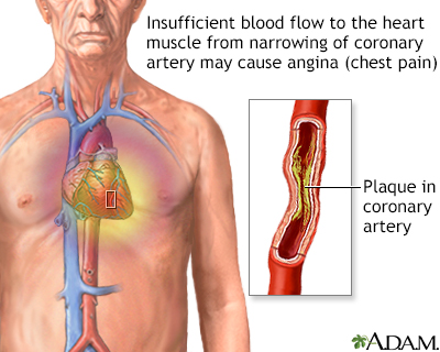 Some people say the pain feels like gas or indigestion. Some patients have symptoms other than classic angina when there is poor blood flow to the heart which may be called their "anginal equivalent." Examples include shortness of breath, back, jaw or arm pain that occur without chest pain. There are different types of angina: Get medical help right away if you have new, unexplained chest pain or pressure. If you have had angina before, call your health care provider. ReferencesBoden WE. Angina pectoris and stable ischemic heart disease. In: Goldman L, Cooney KA, eds. Goldman-Cecil Medicine. 27th ed. Philadelphia, PA: Elsevier; 2024:chap 56. Bonaca MP, Sabatine MS. Approach to the patient with chest pain. In: Libby P, Bonow RO, Mann DL, Tomaselli GF, Bhatt DL, Solomon SD, eds. Braunwald's Heart Disease: A Textbook of Cardiovascular Medicine. 12th ed. Philadelphia, PA: Elsevier; 2022:chap 35. Lange RA, Mukherjee D. Acute coronary syndrome: unstable angina and non-ST elevation myocardial infarction. In: Goldman L, Cooney KA, eds. Goldman-Cecil Medicine. 27th ed. Philadelphia, PA: Elsevier; 2024:chap 57. Morrow DA, de Lemos J. Stable ischemic heart disease. In: Libby P, Bonow RO, Mann DL, Tomaselli GF, Bhatt DL, Solomon SD, eds. Braunwald's Heart Disease: A Textbook of Cardiovascular Medicine. 12th ed. Philadelphia, PA: Elsevier; 2022:chap 40. Virani SS, Newby LK, Arnold SV, et al. 2023 AHA/ACC/ACCP/ASPC/NLA/PCNA Guideline for the management of patients with chronic coronary disease: A report of the American Heart Association/American College of Cardiology joint committee on clinical practice guidelines. Circulation. 2023;148(9):e9-e119. PMID: 37471501 pubmed.ncbi.nlm.nih.gov/37471501/. Writing Committee Members, Gulati M, Levy PD, Mukherjee D, et al. 2021 AHA/ACC/ASE/CHEST/SAEM/SCCT/SCMR Guideline for the evaluation and diagnosis of chest pain: A Report of the American College of Cardiology/American Heart Association Joint Committee on Clinical Practice Guidelines. J Am Coll Cardiol. 2021;78(22):e187-e285. PMID: 34756653 pubmed.ncbi.nlm.nih.gov/34756653/. | |