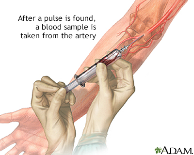 There is a slight risk for damage to nearby tissues when the blood is drawn. Blood can be taken from lower-risk sites, and techniques can be used to limit tissue damage. ReferencesCloutier MM. Pulmonary aspects of acid–base balance and arterial blood gas interpretation. In Cloutier MM, ed. Respiratory Physiology. 2nd ed. Philadelphia, PA: Elsevier; 2019:chap 9. Eiting E, Kim HT. Arterial puncture and cannulation. In: Roberts JR, Custalow CB, Thomsen TW, eds. Roberts and Hedges' Clinical Procedures in Emergency Medicine and Acute Care. 7th ed. Philadelphia, PA: Elsevier; 2019:chap 20. O'Connell C. Arterial puncture. In: Dehn R, Asprey D, eds. Essential Clinical Procedures. 4th ed. Philadelphia, PA: Elsevier; 2021:chap 2. | |