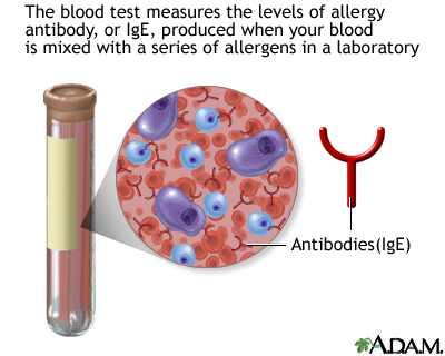 Patch tests - allergy; Scratch tests - allergy; Skin tests - allergy; RAST test; Allergic rhinitis - allergy testing; Asthma - allergy testing; Eczema - allergy testing; Hayfever - allergy testing; Dermatitis - allergy testing; Allergy testing; Intradermal allergy testing DefinitionAllergy skin tests are used to find out which substances cause a person to have an allergic reaction. These substances are called allergens. How the Test is PerformedThere are three common methods of allergy skin testing. The skin prick test involves: