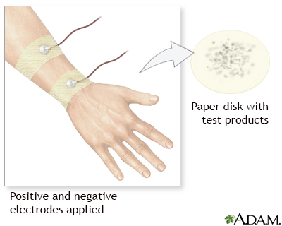 Sweat test; Sweat chloride; Iontophoretic sweat test; CF - sweat test; Cystic fibrosis - sweat test DefinitionSweat electrolytes is a test that measures the level of chloride in sweat. The sweat chloride test is the standard test used to diagnose cystic fibrosis (CF). How the Test is PerformedA colorless, odorless chemical that causes sweating is applied to a small area on an arm or leg. An electrode is then attached to the spot. A weak electrical current is sent to the area to stimulate sweating. People may feel a tingling in the area, or a feeling of warmth. This part of the procedure lasts for about 5 minutes. Next, the stimulated area is cleaned and the sweat is collected on a piece of filter paper or gauze, or in a plastic coil. After 30 minutes, the collected sweat is sent to a hospital lab to be tested. The collection takes about 1 hour. How to Prepare for the TestNo special steps are needed before this test. How the Test will FeelThe test is not painful. Some people have a tingling feeling at the site of the electrode. This feeling may cause discomfort in small children. Why the Test is PerformedSweat testing is the standard method for diagnosing cystic fibrosis. People with cystic fibrosis have higher amounts of sodium and chloride in their sweat that are detected by the test. Some people are tested because of symptoms they are having. In the United States, newborn screening programs test for cystic fibrosis. The sweat test is used to confirm these results. Normal ResultsNormal results include:
