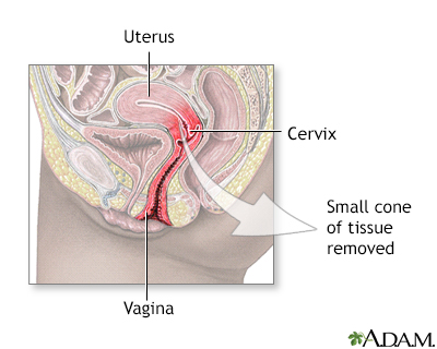 Biopsy - cone; Cervical conization; CKC; Cervical intraepithelial neoplasia - cone biopsy; CIN - cone biopsy; Precancerous changes of the cervix - cone biopsy; Cervical cancer - cone biopsy; Squamous intraepithelial lesion - cone biopsy; LSIL - cone biopsy; HSIL - cone biopsy; Low-grade cone biopsy; High-grade cone biopsy; Carcinoma in situ-cone biopsy; CIS - cone biopsy; ASCUS - cone biopsy; Atypical glandular cells - cone biopsy; AGUS - cone biopsy; Atypical squamous cells - cone biopsy; Pap smear - cone biopsy; HPV - cone biopsy; Human papilloma virus - cone biopsy; Cervix - cone biopsy; Colposcopy - cone biopsy DefinitionA cone biopsy (conization) is surgery to remove a sample of abnormal tissue from the cervix. The cervix is the lower part of the uterus (womb) that opens at the top of the vagina. Abnormal changes in the cells on the surface of the cervix is called cervical dysplasia. How the Test is PerformedThis procedure is done in the hospital or in a surgery center. During the procedure: