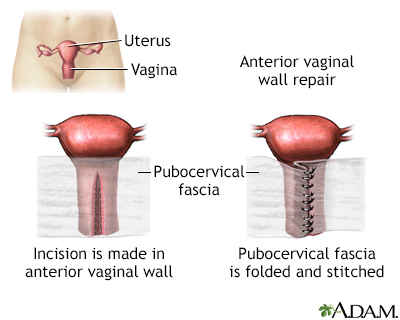 Vaginal wall repair; Colporrhaphy - repair of vaginal wall; Cystocele repair - vaginal wall repair DefinitionAnterior vaginal wall repair is a surgical procedure. This surgery tightens the front (anterior) wall of the vagina. DescriptionThe anterior vaginal wall can sink (prolapse) or bulge. This occurs when the bladder or the urethra sink into the vagina. The repair may be done while you are under: